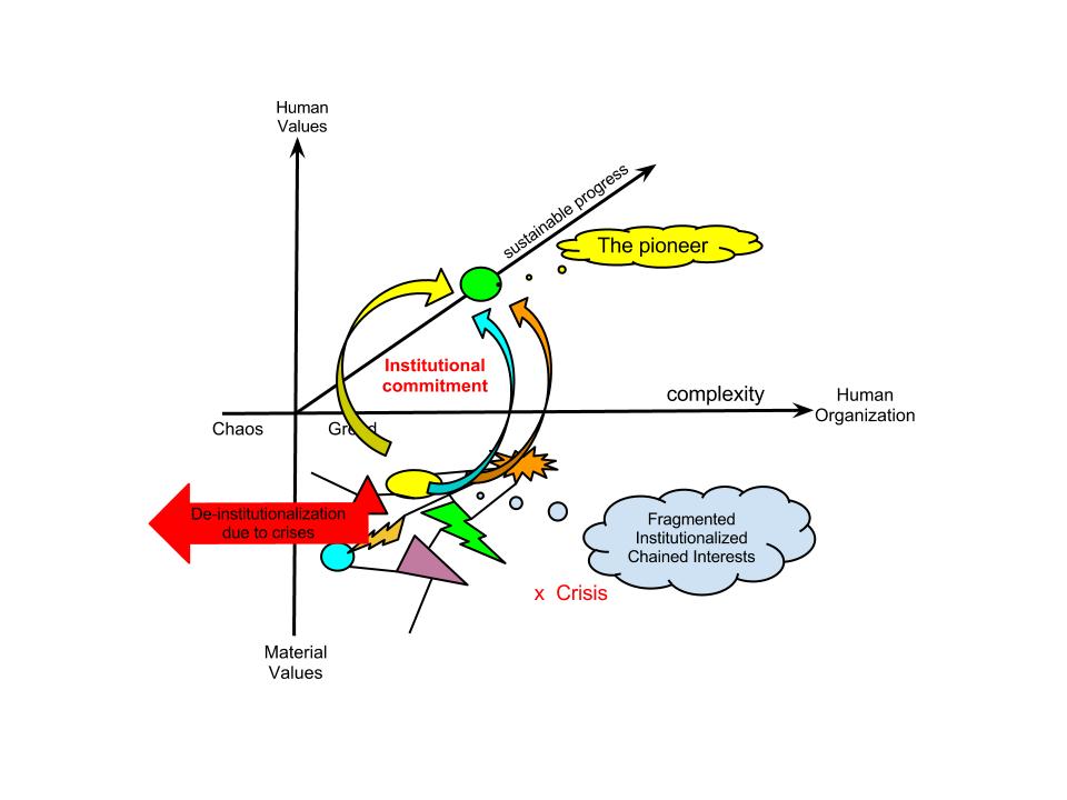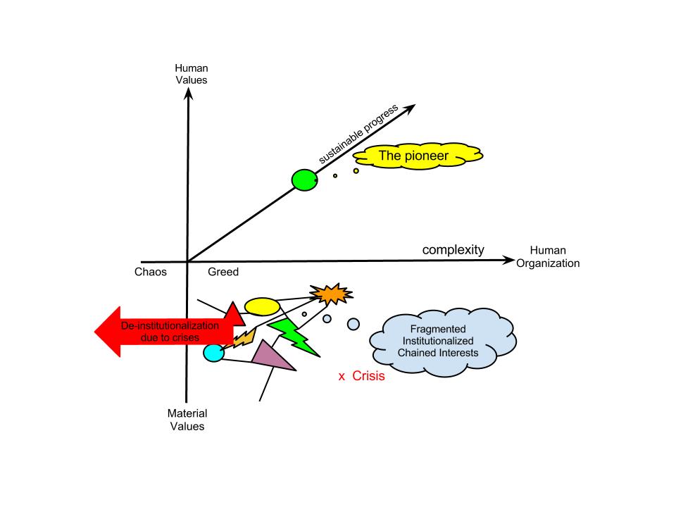 The role of the pioneer is to define complex progression based on human values. When inviting the institutional powers to join the pioneer they are asked to enhance the responsibility with their own institutional powers. To make a holistic proposition of human values one cannot just rely on a single empowering institution. If that were the case the institution would have done this already by itself. The complexity of the whole is that it needs the entire mix of authorities of a society to become effective, with the pioneer sitting bang in the middle.