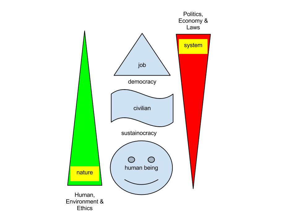Experimenting with the new democracy, Sustainocracy, we even structure a new society around this human perspective, respecting the old one partially, as we need certain systems from specialized functions they carry for us to use as instruments. We cause a transformation of society from the dominant blocking to one that is transparent cooperative.