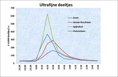 The weather that night was favorable to reduce the effects of pollution with certain speed. There was a light rain and a breeze of wind. We see that the peaks of larger particles seem to disappear quicker that the UFP. The behavior of the various particles is subject of scientific analysis still so little conclusions can yet be drawn.