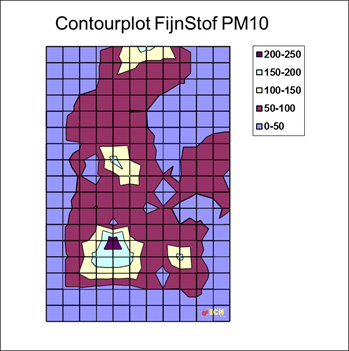 The PM 10 average from midnight till 1:00 am was mapped over the city, showing areas of extreme pollution (the lightest areas on the map with the purple area of pollution).