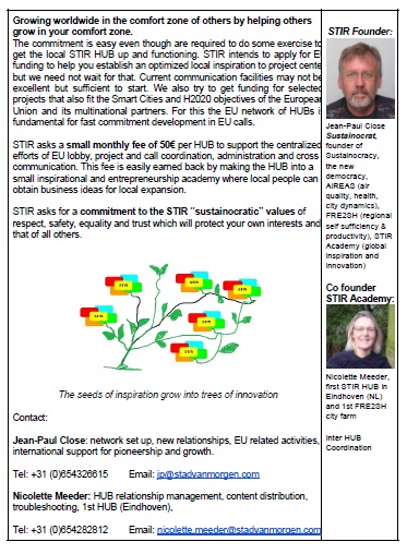 STIR Academy is becoming the European standard for inspiration sharing and co-creation for sustainable human progress (Sustainocracy). We deal with the growth potential of promising and proven pioneers in member city and countries. The network is reciprocally based (you give and get 100 back) from inspiration to realization.