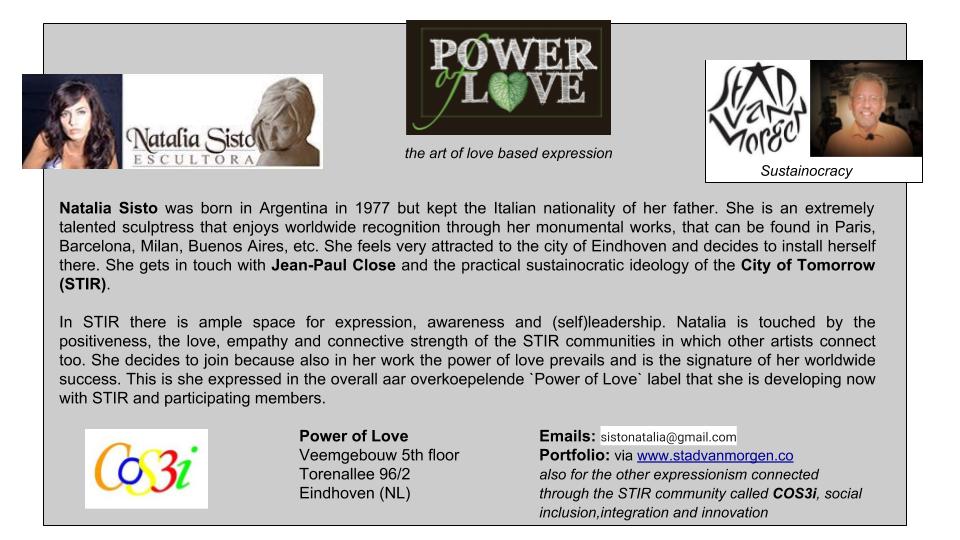 The Power of Love is an indicator that shows the expressionist potential of the heart through passion, dedication, vision, leadership and artistic manifestation. Whether it is the design of scuptures, a dance, a painting, new design patterns for city and regional development or the entire redefintion of society. This united Natalia and Jean-Paul as feminine and masculine unification, creating together a powerfull community of passionate expressionist men and women that together contribute to local and global sustainable human development and progress.