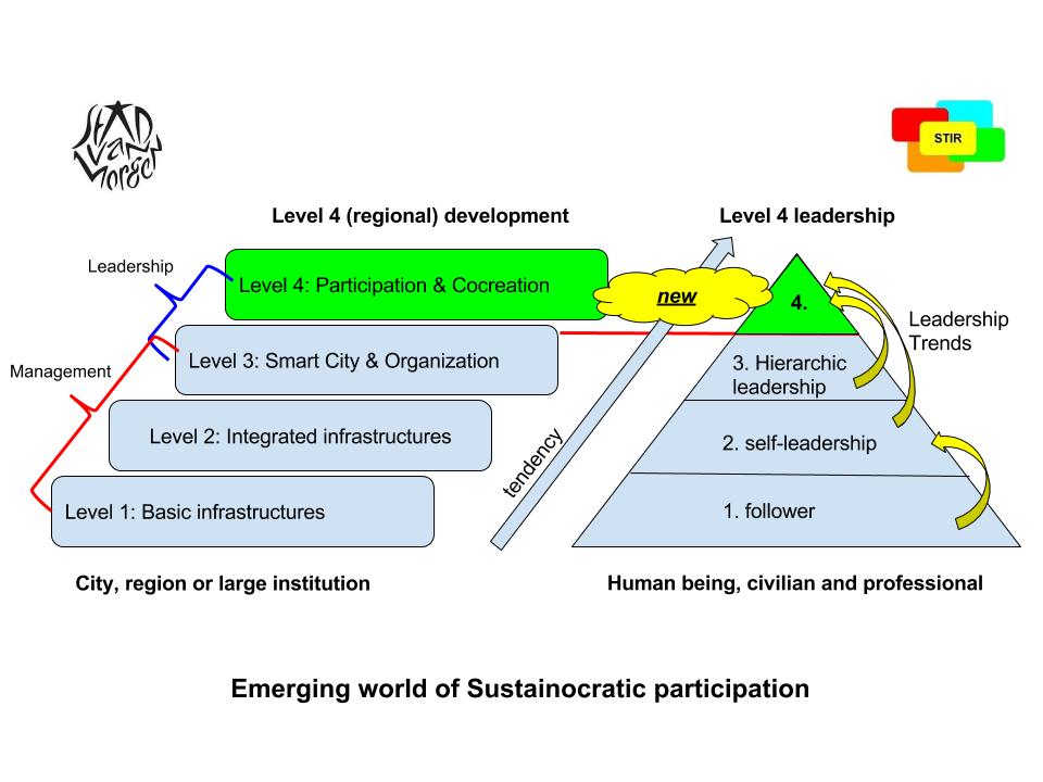 Contrary to the old political economic reality, where space is held around fragmented political and economic interests, here the holistic space is held by the Sustainocrat defending the human evolution aspects by representing the core human values. He or she tries to engage the four pillars of society: local citizens, local government(s), innovative entrepreneurship and scientific / educational partners. All sit around the table at the same time. This is referred to as level 4 awareness driven regional development. It was accredited for the first time in 2015 when it also received a European Award for partnership Innovation.