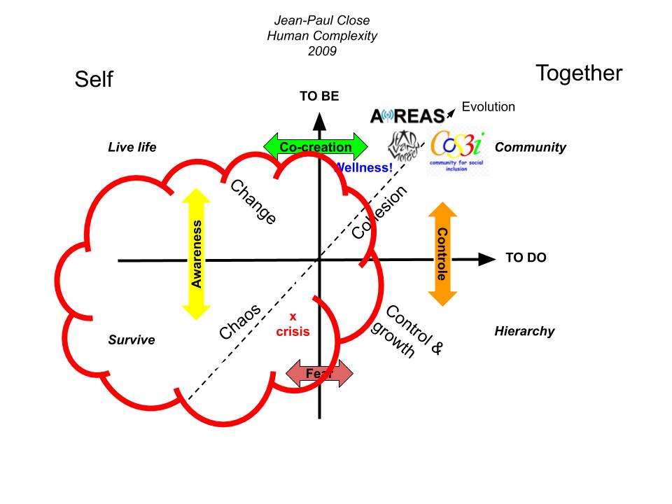 Government is in fact a well described and often imposed illusion of security. Our Taiwan innovators state “Once people get the idea that you don’t need a government to do governance, then people get into the true spirit of collaborative governance.” In my own human complexities drawing we see that this move to collective governance is never a direct step, as it was not in Taiwan either. There are two fields in between letting go of control and defining harmonic clustering of society: chaos and awareness. In the case of Taiwan this was covered by open source technology and the positive invitation to participate. In the Netherlands it was covered by defining our core natural and the positive invitation to participate. In both occasions it was preceeded by chaos. In Taiwan the 2014 public uprise, in the Netherlands the 2008 credit crisis. And in both occasions the open invitation to participation is rewarded by involvement, being taken seriously as engaged citizen or institution, and eventually the measurable growth of commonly shared core values.