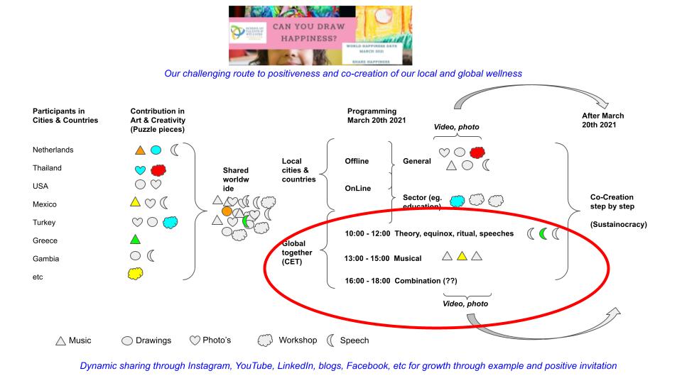 The project has developed a global presence through the efforts of many people. A dot on the horizon is the 20th of March, the World Happiness Day. The meeting was focused on trying to create a program out of all the contributions we receive. In the picture the entire flow is shown. In the red oval circle we see the proposed structure of the day.
