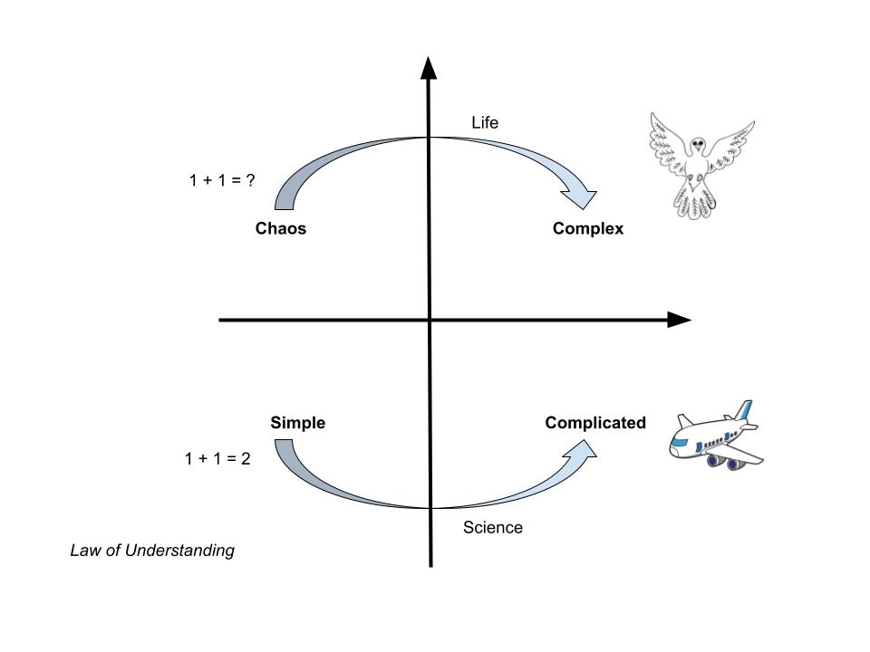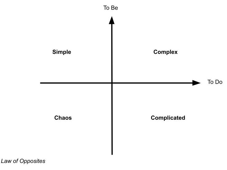 The phylosophy shows the law of opposites that interact. Chaos versus Complex, Simple versus Complicated. It is very much related to our evolution as a species from an awareness point of view and the way we structure our society (To Do) around new waves of awareness ( To Be). There is another way of drawing this which is by positioning the interpretation of science of life and the way life functions.