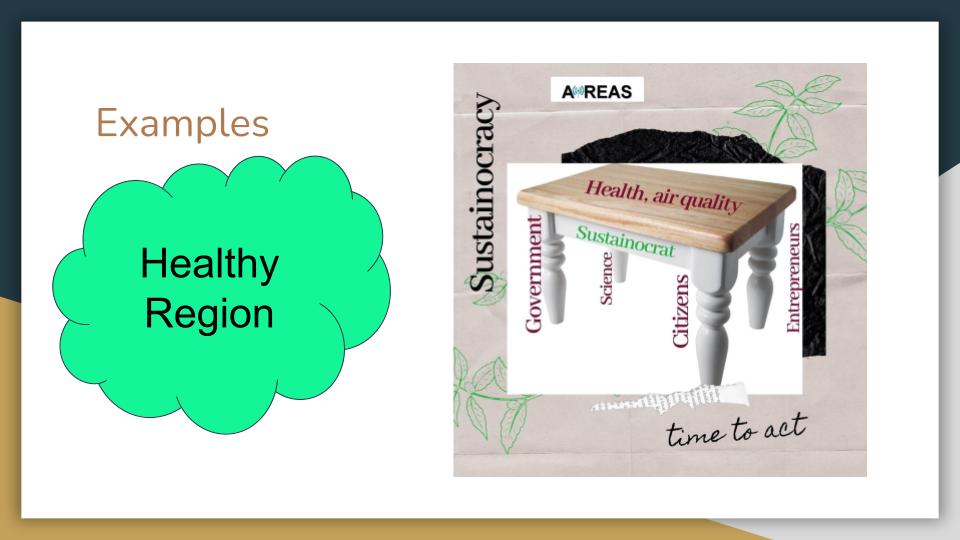 In practice a level 4 participation table looks like this. It is being chaired by a Sustainocrat who represents the human being and the core values. The Sustainocrat unites all regional stakeholders at the same time based on equality, without hierarchy. In the case below regional air quality and health is leading. The multidisciplinary table and prioritized focus is a movement represented by a name: AiREAS (Air and Areas). Meetings are project and results driven, generally every three months or when needed. During the meetings decisions are made, resources allocated and responsibilities agreed among all. Many simultaneous projects can be defined at the same time, all in a SMART way. They are allocated funds with a 10-10-80 distribution: