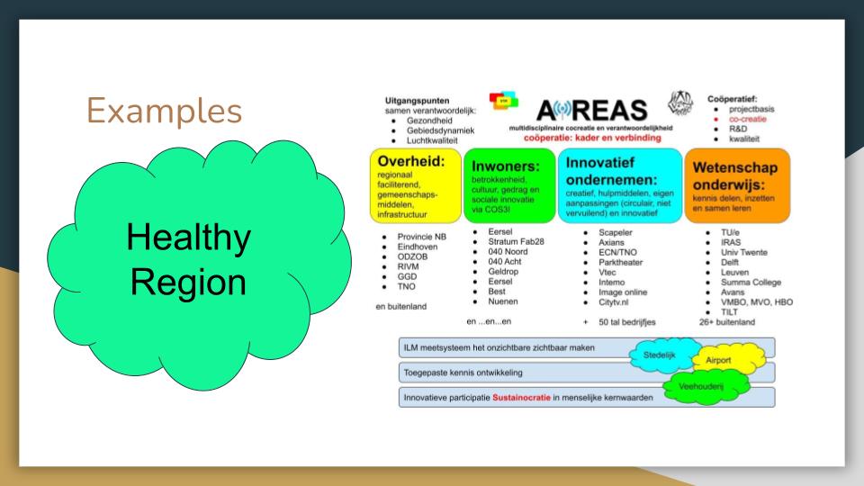 On the next slide you find examples of layer 4 Sustainocratic initiatives in the region of Eindhoven. The one on regional air quality (AiREAS) is the most consolidated and proof of concept. Its progress has been published and can be downloaded here free of charge. The healthy city focus was caused by the old political geographical bounderies. Gradually the initiatives expanded regionally, interregionally, cross border and with very broad participation.