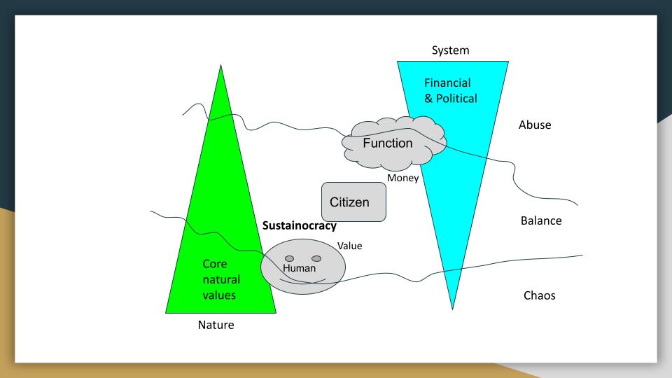Balance is found by finding a progressive and sustainable interaction between nature, our community and our functions. Sustainocracy positions itself at the side of our biological selfs and redefines our citizenship and system functions around a set of core natural values that are key for any lving species, including us a human beings and our sustainable resilience.