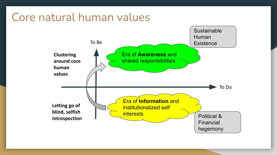 The only way to address and restore our core natural human values effectively is to let go of the political and financial hegemony of fragmented interests while concentrating on our shared responsibilities in the cocreation of these core values. This is where the power of citizens networks come in. We are closest to our authentic human nature and hence the only real reliable resource for effective change through awareness and purpose driven action.