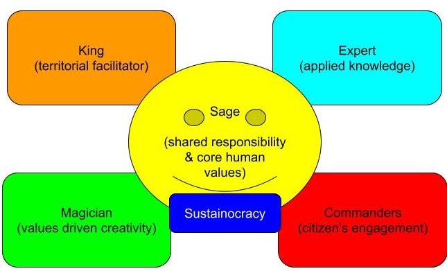 In Sustainocracy we recognize at least five leadership styles (thankyou Sujith Ravindran for the clarification). These are the Sage or Story teller, the King, the Expert, the Magician and the Commander. In our current society they have structured themselves in a hierarchy under the storytelling of a money driven and dependent reality. In our new reality we integrate the leadership styles around the storytelling of core natural human values (see below). Each leadership area is equal to the others and together form a solid foundation for regional inner peace development through lasting and shared wellness.