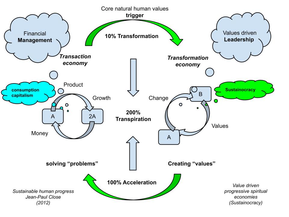 Key in the Sustainocratic processes is the constant reflection about the core natural values and the willingness to make adjustments in behavior, projects, the infrastructures and even old legislation, by applying the leadership archetype skills to the max. It is always difficult to introduce change, yet if it is well motivated it serves as an example for others to follow. Whatever is created together in this phase of purpose driven change can feed new impulses of the economy of growth, not just in its absolute sense, also in the sense of balanced profitability or investments by optimizing costs reductions too.