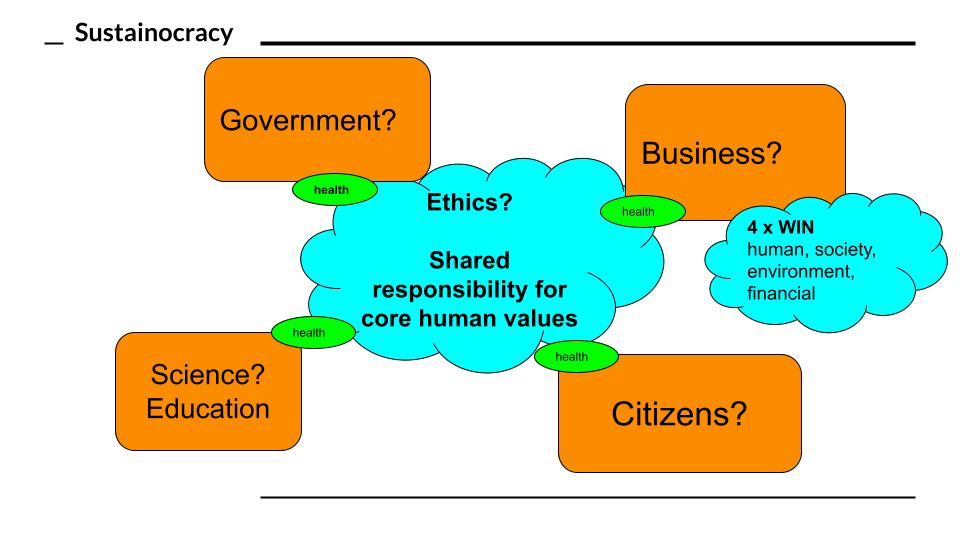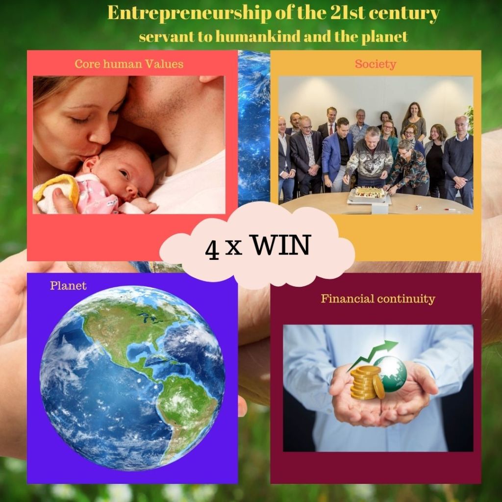 Our current money dependent and ethically structured society is not 4 x WIN at all. It is still based on the old industrial era in which business takes freely and abundantly from nature to economize these resources through products and services for financial profitability (1 x WIN). The government supports this through the provision of services, infrastructures and remedial measures at a cost. This is also the origin of the ethics in this format of society. Can this be enhanced by the shared responsibility philosophy of Sustainocracy? Yes it can, as we are showing in the region of Eindhoven with a diversity of communities that apply the methods with involvement of government, science, education and business.
