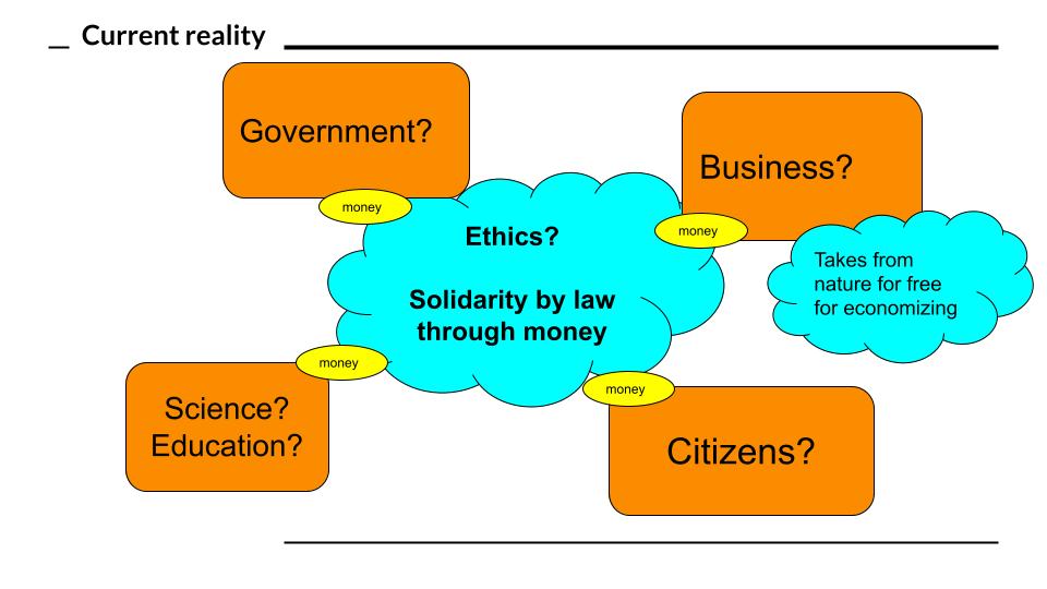 The solidarity claim through money gives rise to all kinds of issues such as inequality, discrimination, power play, corruption, bureaucracy, public apathy, etc. This also leads to conflicts, wars, instability and injustice from an humanitarian or ecological point of view. The money claim may justify this, even by law, while putting a lot of money in remediating the damages. However, the ethics needed for sustainable human progress, do not. There are plenty of signs that this society format is on its way to eliminate our sustainable expectations as a species. In other words, we destroy ourselves.