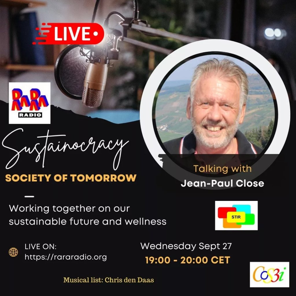 Every month we will add a new podcast in English about Sustainocracy on our list of open dialogues. On sept 27th we start with the first one, LIVE in Rara Radio, from 19:00 till 20:00 CET (Amsterdam time). The program will combine dialogue about our views on society with music.