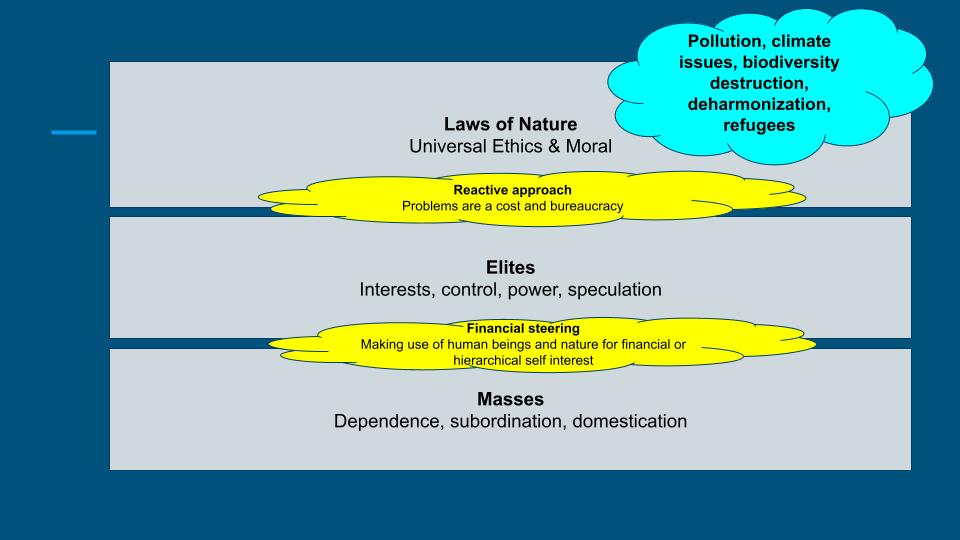 When a few thousand years ago someone started to claim ownership over common resources such as land, a well, a river passage, etc, he or she began to ask for favors (taxes) from others that wanted to make use of these resources. A hierarchy of power and dependence was born that could be used and misused for the benefit of those who started to refer to themselves as “the elite”. Gradually this became the basis of a global human system of individual interests that developed into political, religious and financial hierarchies that use and abuse humankind and our planet for their self interest. Humankind reacted through uprise demanding human rights that further developed the dependence and layers of power. Meanwhile our planet was depleted of resources, polluted and destroyed of its living essentials. Today we realize that it is this human system of use and abuse is dangerous, obsolete and artificially upholding itself through manipulation, wars, suppression and crime at the expense of huge human suffering.