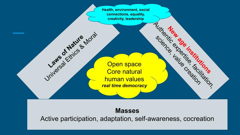 Instead of fearing this abyss there is the comfort and joy of joining a new era. That is the era of shared responsibility between citizens and institutions to develop the essential values of our existence together. It is done in symbiotic co-creation with our natural environment. It represents a different citizen and institutional mindset (second image) in which there are plenty of success factors to be found for all involved. The images below show the emerging new reality in which all current societal players still play their own role, however committing in word and action to our essential human values.
