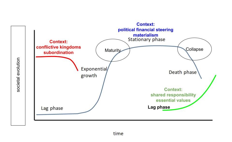 The current era can be characterized by organized political financial materialism. A culture that affects all sectors of society, such as citizens, business, government, science and education. The era developed itself gradually in the 17th century when businesses started to dominate the playing field, demanding investments in education and infrastructures for their financial growth scenarios. Currently the growing costs of the care society and all remedial actions to address the negative degenerative spiral, are putting even larger performance pressure on the financial growth demand of society. The era is pushing itself towards the abyss of the unsustainable and collapse (see first image below).