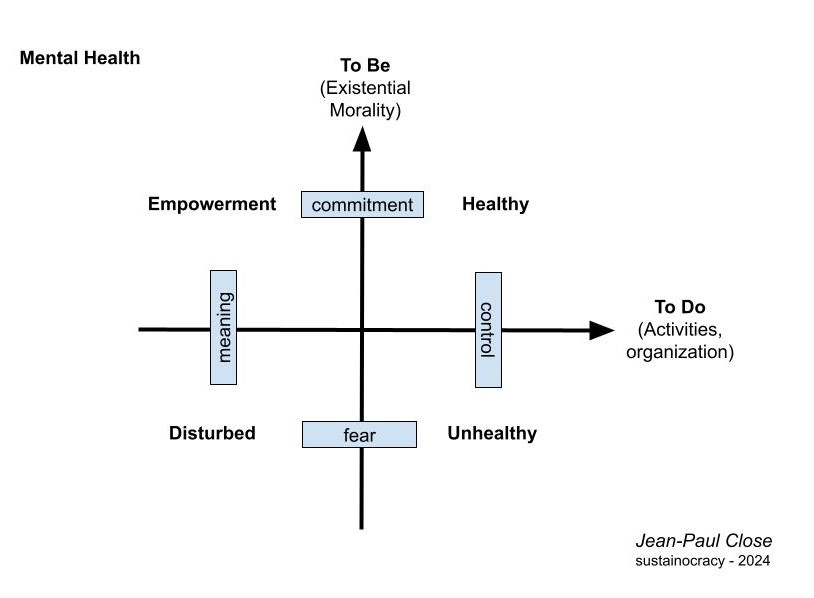 The current uni-dimensional money-driven society is structurally unhealthy and produces mental ill health as can be seen in the culture of fear that is also fueled by the polarization of political parties. The entire financial political structure is located in the unhealthy, immoral quadrant of the drawing. This is reflected in the many problems in the world that are often caused by this competitive control politics. We are all part of that, partly due to the forced dependency imposed by the system. My own personal turning point brought me to the point of commitment to human values. At that time I had no idea of the impact of this on the mental health of me and my environment in general. This is because I first had to let go of forms of unhealthy control and fears. I was able to do this with confidence because of the meaning that had invaded me. In all the activities that I subsequently developed, healthy, warm interpersonal ties were created, also with people in hierarchical positions of all kinds of companies and institutions, including governments. The shared commitment to, for example, the “healthy city” approach in Eindhoven and the surrounding area provided a healthy mental dose of meaning, creativity, mutual connections and goal-oriented motivation. These are all building blocks for mental health, in contrast to fear, uncertainty, competition, hatred, judgment, jealousy, etc. that are caused by our one-sided social management based on money, dependency, performance, political interests, competition, inequalities, control, meaningless growth (with many negative impacts), etc. We are often unaware of the mental ill-health that this form of society causes because we are completely mentally absorbed in the activities (work, consumption, entertainment) that are expected of us or have become part of our blind comforts. We often feel the symptoms of mental disturbance and unrest but do not make conscious connections because of the culture in which we live. We only notice the real difference when we let go of this, experience the turning point ourselves and let the meaning do its work. With Sustainocracy everyone has a choice. But the choice has a price. That price is not expressed in money but in letting go of control and fear, and embracing human values and cooperation. Mental health is a result.