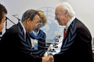 Mr. Jean-Paul Close and Ms. Hélène H. Oord in front of the United Nation’s flag symbols at Worldview Mission headquarters