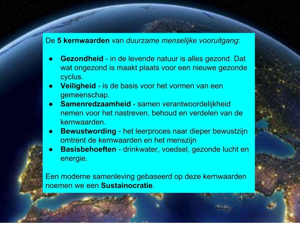 In Sustainocracy we position “the human being” and our core natural values at the kernel of our thinking and dealing with reality. It is all about the wellness we create together, our continuity and evolution as a species. Then suddenly different rules count than the current political and economically geared situation that made us dependent of a costly hierarchical structure. For many only this single reality exists because of their dependence on it. “It is as it is”, people state with apathy. With this attitude they reason about everything as soccer player that wants to play basketball by using only soccer rules. That cannot be done of course. It is not as it is, it is the way we interpret our reality and act accordingly. Big challenges such as pollution, deforestation, destruction of life on Earth, inequality, climate change, illnesses, etc get us to think differently. To that understanding belongs new models and behavioral patterns.