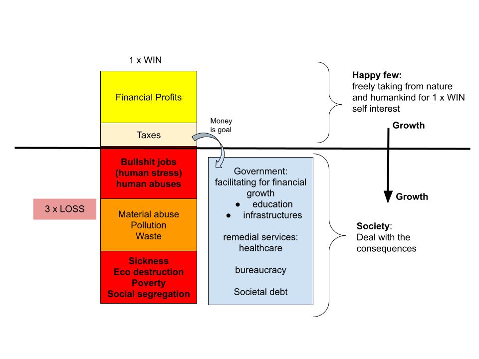 Our current money dependent society is based on a law abiding solidarity with the financial system. Despite having brought us many benefits it is also the main threat of our self destruction. Humankind is in desperate needs of new generalized ethics to transform the self destructive trajectory into one of sustainable human progress with newly structured shared wellness. Sustainocracy provides these ethics, based on the old evolutionary principles of core human values and share responsibilities. But first let´s look at the flaws of a system that we have been obliged to be part of.