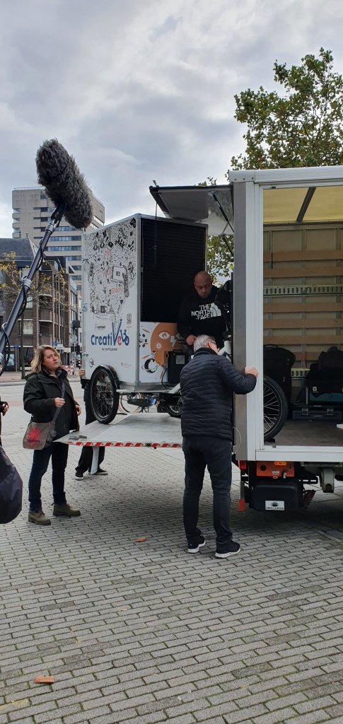 Our vehicle is the CreatiVelo, an electric bike with modifications to carry the cameras and materials. The crew follows with private cars, a van and often with cyclists joining the voyage. Between Luxemburg and Glasgow, during the month of October, video messages, statements, positive examples and personal stories are collected along the way. These two days we were receiving the caravan in Eindhoven. It became a heart warming experience. Here some photo’s. In the next blog we will share some video impressions….