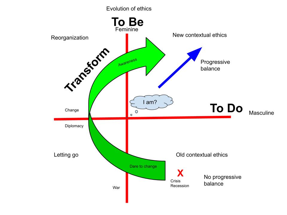 In our money driven era the masculinity of the doing has also extended to the women. In consumer economies women have become as masculine as their counter parts, emancipating for financial independence at the expense of femininity. In the area of greed (see drawing) the true feminine meaning of “being” has been abolished. Its evolutionary meaning has been taken over by the meaningless invention of money and individual financial independence within the modern tradition of financial growth. Money indeed has freed women from a home bound slavery and formalized equality in human rights between men and women in many parts of the world. This tendency is well received and essential for sustainable human progress even though the original motivation to free women from their masculine suppression has logically been more economical and political than based on universal truths and ethics. Nevertheless it allowed a new culture to arise in which the true equality can be developed in a new era of awareness.
